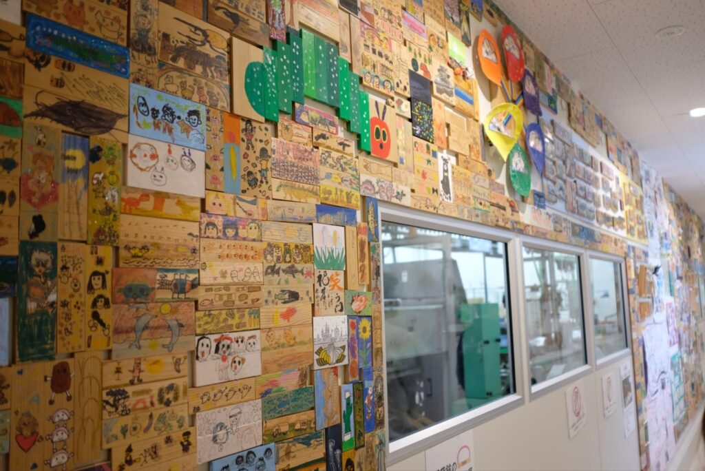 工場の通路に展示してある素敵なアートは全部、かまぼこ板!