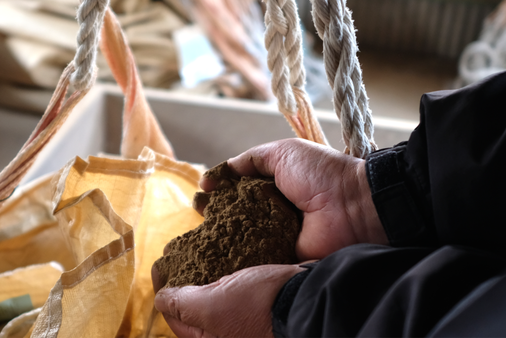 こだわりの餌に使われる、魚粉(左の写真)とみかん(右の写真)。