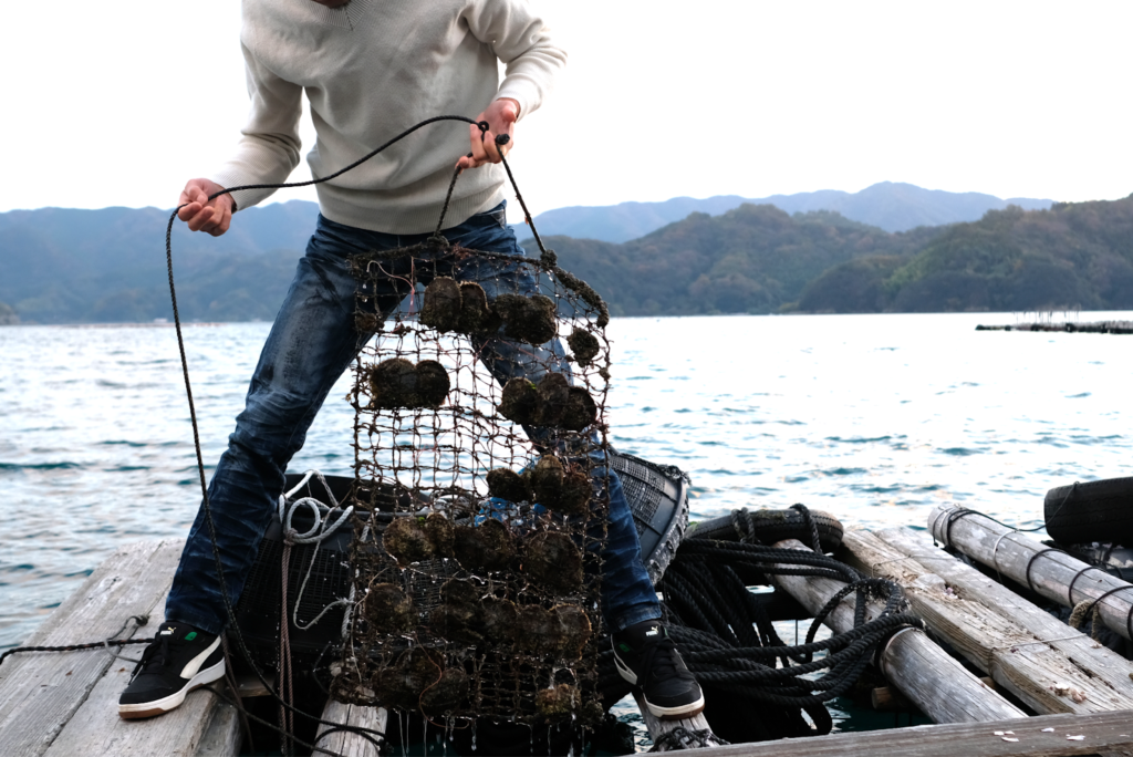 水から引き上げてアコヤガイとご対面。