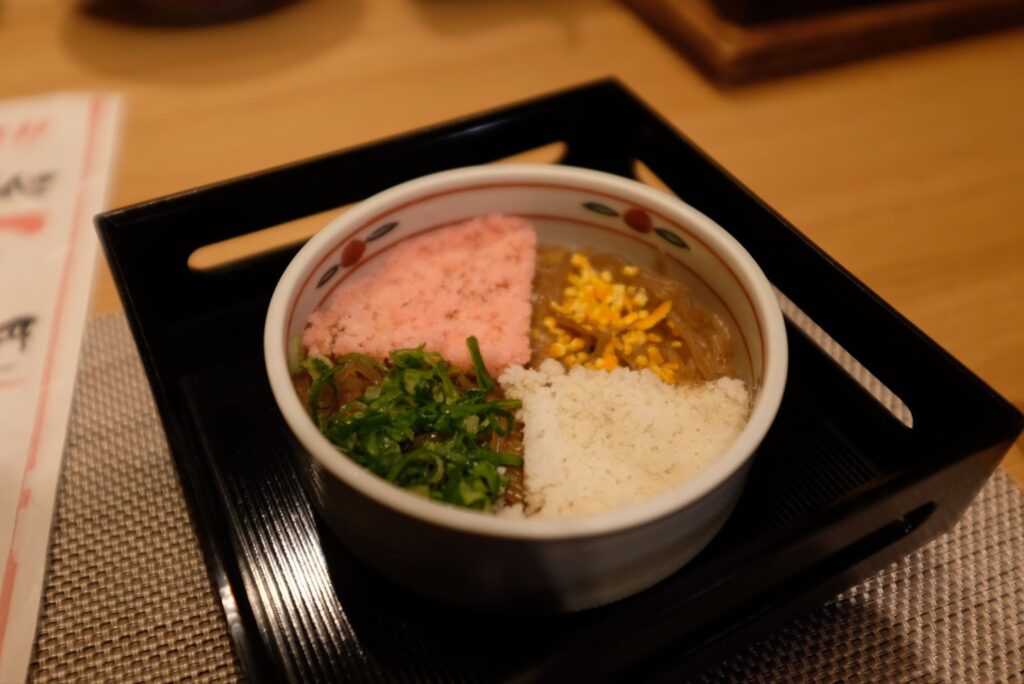 そぼろ、ネギ、みかんなどで4色で四季を表しそぼろを冬とし、四季を表すし